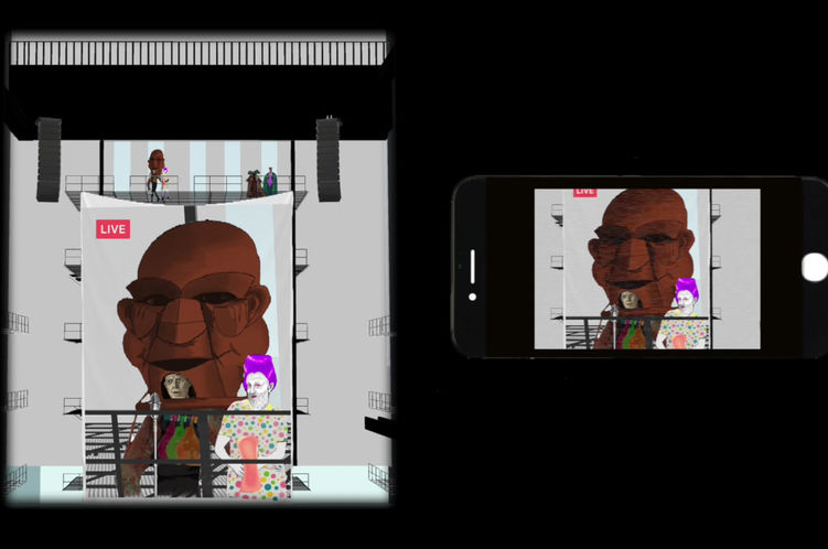 Starting as an immersive piece where audiences are offered mobile devices and given an induction on how they can explore this space, it soon becomes clear that viewers are in fact restricted to a certain area where they can choose to sit down or move around. When a scene happens far away, they have to rely on screens and headphones. Their sources of information are getting restricted, they’re also part of the system.